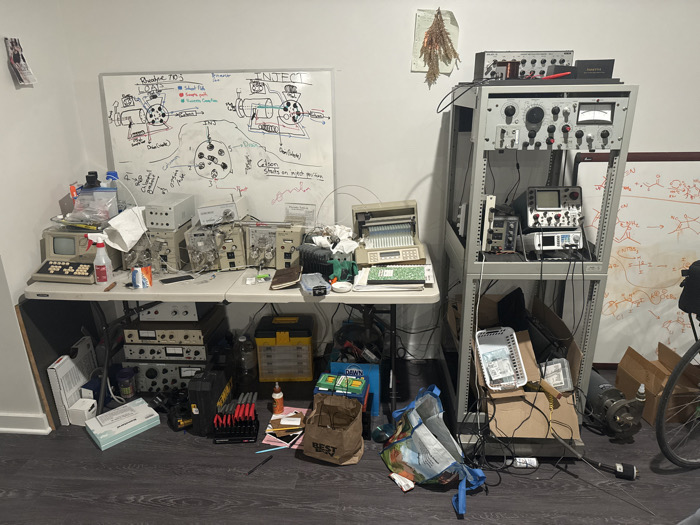 A cluttered workbench features a whiteboard with technical diagrams and notes. Oscilloscopes, vintage computer equipment, and other electronic devices crowd the table and floor space. A metal equipment rack houses more electronics. Below, boxes, bags, and tools add to the disarray. A bicycle is visible on the right side of the frame. The overall impression is of a well-used, functional workspace for electronics and technical experimentation.