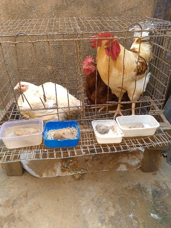 Three chickens are confined within a rusty wire mesh cage, situated outdoors in Agege, Nigeria. A large, cream-colored rooster with a prominent red comb stands on the right side of the cage, partially obscuring a smaller, dark brown hen also standing. On the left, a large white hen is seated on the cage's wire mesh floor. Beneath the sitting hen and rooster, on the cage floor, are three small rectangular plastic containers: one clear container holds water with a light-colored stone, a blue container holds light-colored grain feed with a stone, and a white container holds similar feed with a darker stone. The cage is elevated by a concrete support block and a wooden post. The ground below consists of light brown dirt and a damp, stained concrete slab. A textured, light brown wall is visible in the background.