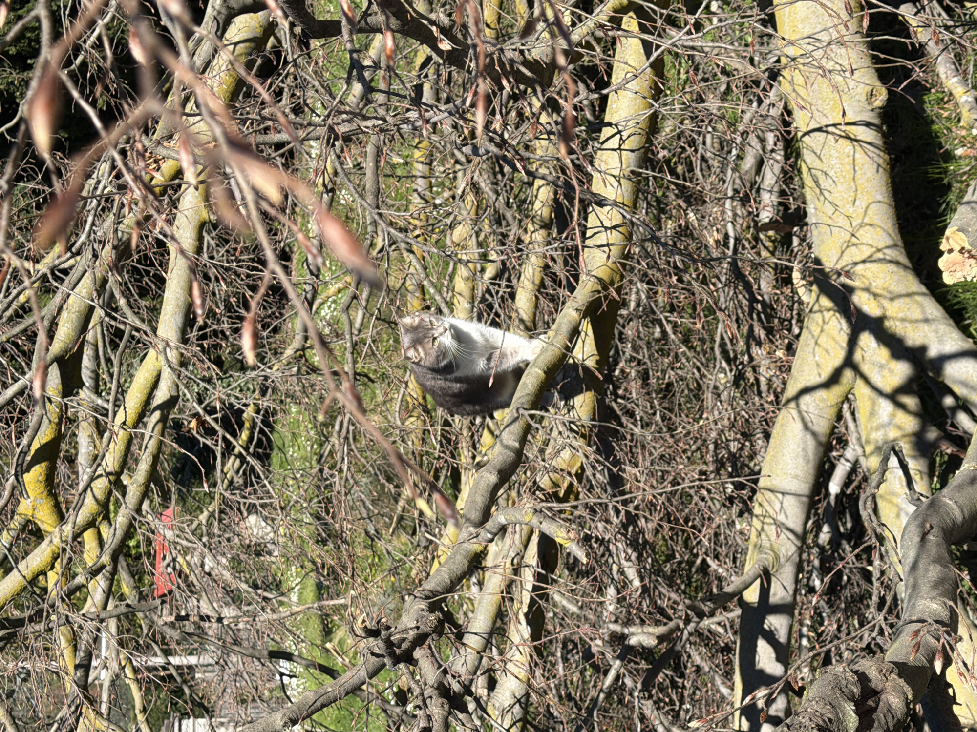 This image depicts an outdoor scene in Erba, Italy, on a bright, sunny day. The central subject is a gray and white tabby cat, positioned on a thick, bare tree branch that extends horizontally across the midground. The cat is facing slightly to the viewer's right, looking forward, with its white chest and face prominently illuminated by direct sunlight. Its greenish-yellow eyes are open, and its front paws are visible on the branch. The cat is surrounded by a dense, intricate network of bare, brown tree branches, some of which exhibit gnarled textures and are partially covered in pale yellow-green lichen. Small, reddish-brown buds are visible on some of the thinner twigs, indicating late winter or early spring. Sunlight casts distinct, fragmented shadows of the branches across other branches and onto the ground below. The ground, visible through the gaps in the branches, is covered with bright green grass speckled with small white flowers. In the upper left background, partially obscured by the branches, a red-colored object, possibly a roof, and hints of a light-colored structure are discernible.