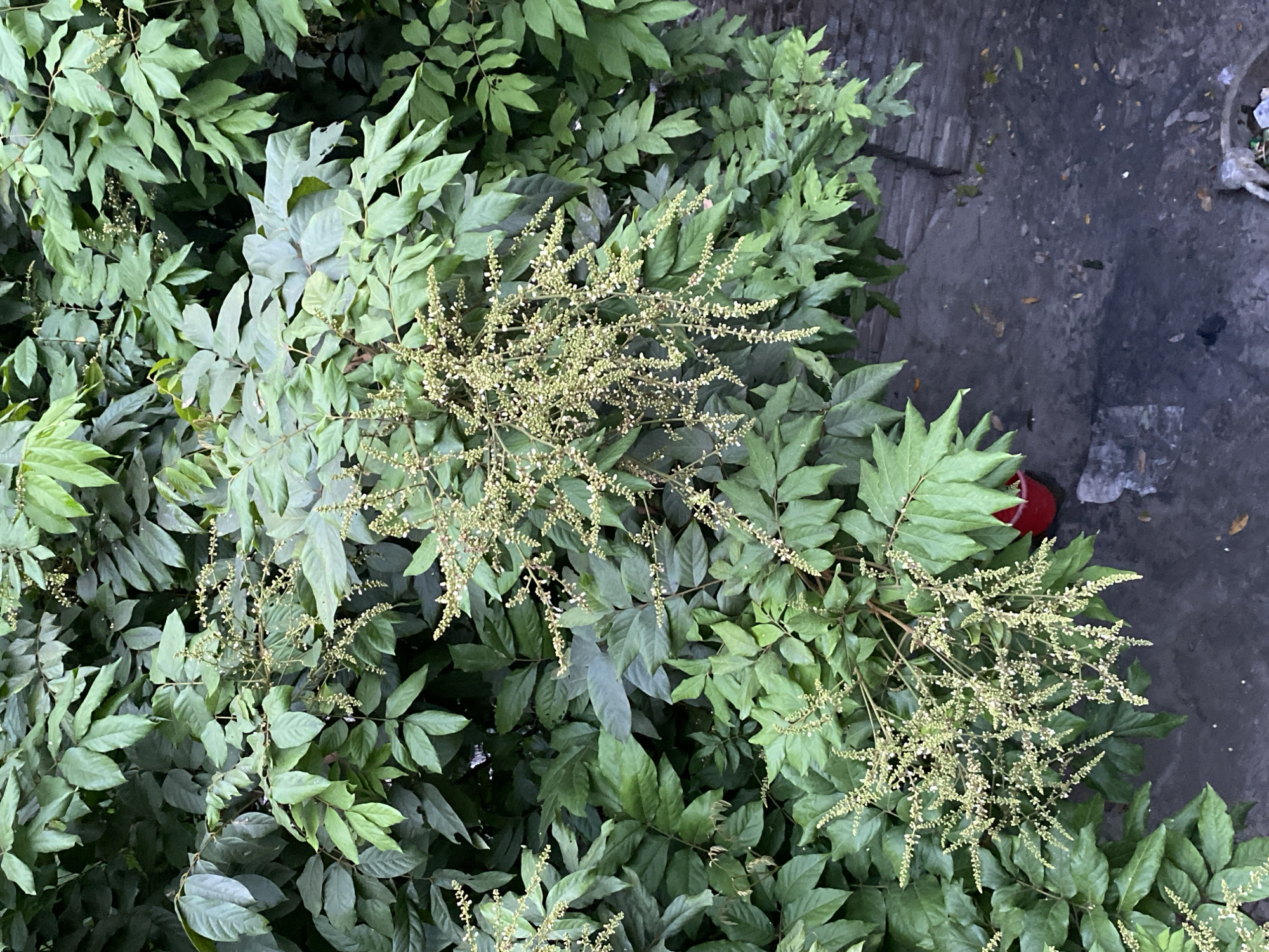 lush, green foliage with visible inflorescences, likely taken from an elevated perspective. The leaves are compound, displaying multiple leaflets per leaf stalk. The inflorescences are densely packed with small, light-colored flowers or buds. To the top right, a concrete or paved surface is visible, with a small red object partially in view, and some scattered debris. The location is specified as Unknown, Bangladesh. No people are apparent in the image.