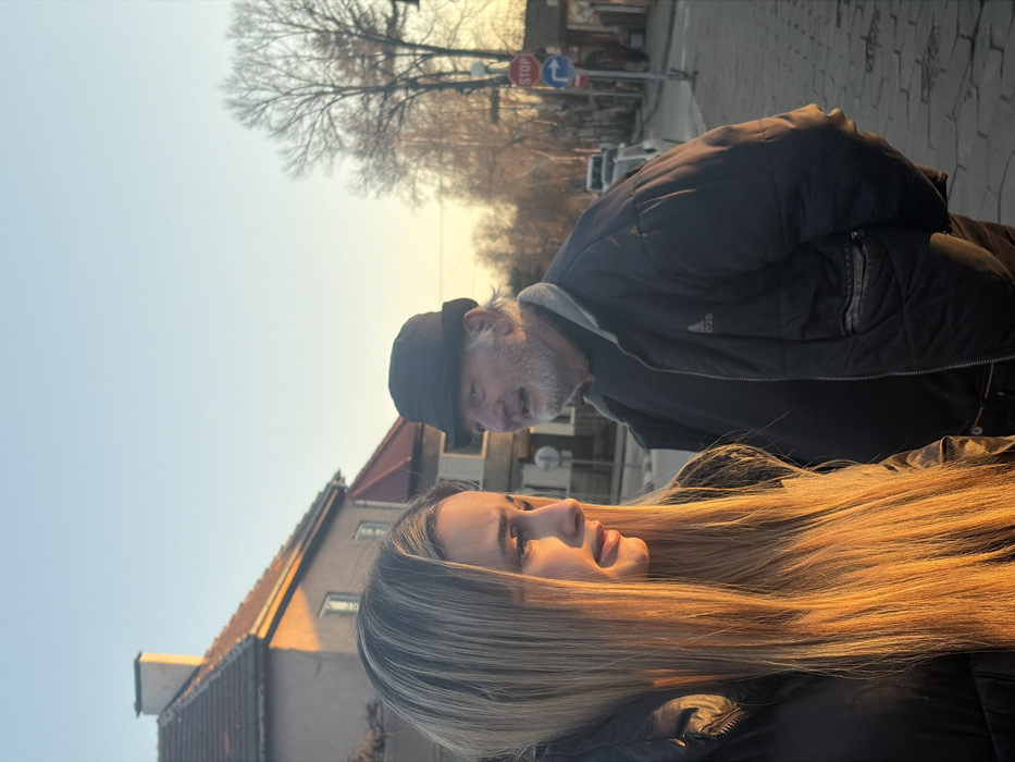 An outdoor scene in Cherven Bryag, Bulgaria, depicts two individuals during what appears to be late afternoon or early evening, characterized by warm, low-angle sunlight. In the foreground and left, a young adult female with long, straight blonde hair, wearing a dark puffer jacket, stands with her head slightly tilted down and to her left. Her facial expression suggests distress, with her eyes downcast and mouth slightly open as if crying or on the verge of tears. Her hair and the right side of her face are brightly illuminated by the setting sun. To her right and slightly behind her, an older adult male stands wearing a dark fedora-style hat, a dark puffer jacket with an Adidas logo visible on the left chest, and a dark shirt underneath. He has a white beard and is looking towards the left, potentially at the female. His face and beard are also illuminated by the warm sunlight, revealing some missing teeth in his upper jaw. The background on the left features a two-story residential building with a reddish-brown tiled roof and a light-colored facade, partially illuminated by the sun. On the right, a paved street or sidewalk with visible cobblestone-like textures recedes into the distance. Bare trees, indicative of late autumn or winter, line the street. A red octagonal "STOP" sign and a blue circular "TURN RIGHT" arrow sign are visible on a pole further down the street. A white vehicle is partially visible in the distant background. The sky is clear and light blue, transitioning to a warmer yellow-orange hue near the horizon.