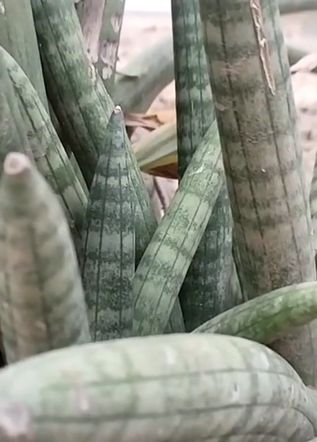 close-up of a snake plant. The leaves are green and cylindrical with horizontal patterns. There is a small dead branch visible among the leaves. The background is out of focus, showing a sandy or earthy surface.