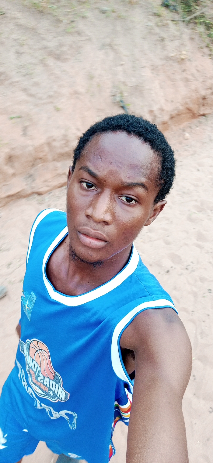 A young Black man with short, dark hair poses outdoors wearing a blue basketball jersey with white trim. He is looking directly into the camera. The background appears to be sandy or dirt ground, with some blurry vegetation in the distance. His facial expression is neutral, with a hint of a frown. The jersey has a graphic design with a basketball and the word "MIDAS".