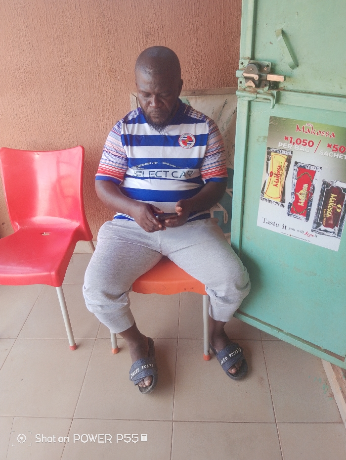 The scene depicts a covered outdoor area in Unknown, Unknown. An adult male, with dark skin, a bald head, and a short beard, is seated on an orange plastic stool. He wears a blue, white, and red horizontally striped t-shirt with a club crest and "SELECT CAR" text, grey capri-length sweatpants, and dark blue "WALKED WOLFE" slides. His hands are interlocked in his lap, and his gaze is directed downwards. To the left of the subject, a red plastic chair stands against a peach-toned wall. To the right, a light green metal door, featuring a rusted latch, has a white poster affixed. The poster advertises "Makossa" sachets for "₦1,050 PER BAG" or "₦50 SACHET," displaying images of yellow, red, and dark red/purple sachets, with the partial text "Taste it with Jepa!!!". The floor consists of light-toned tiled flooring.