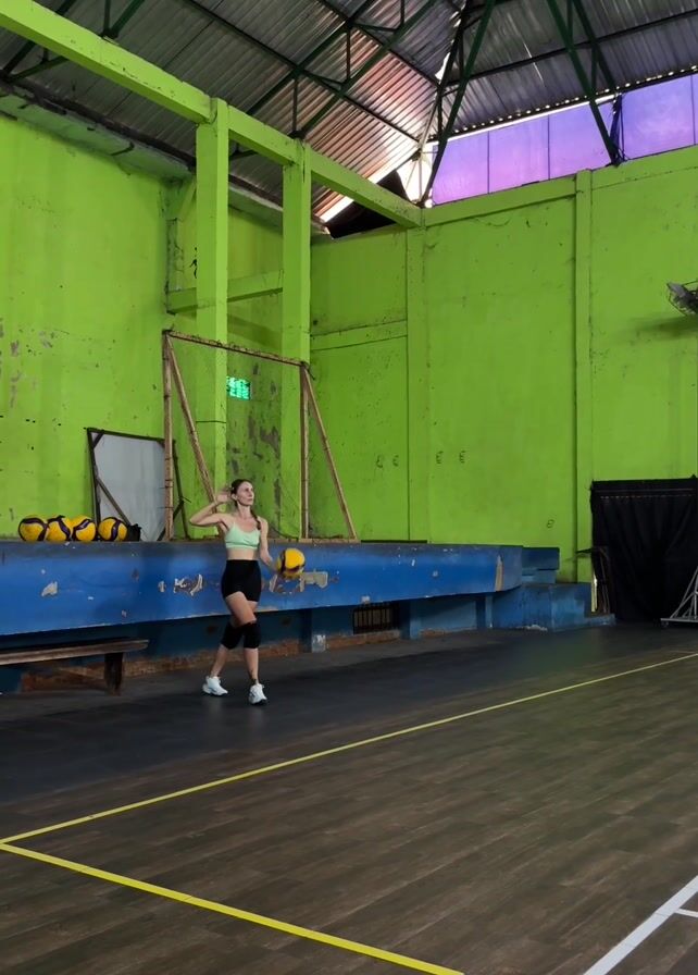 volleyball game taking place inside an indoor gymnasium with green walls, a blue platform, and a metal roof. A woman in a light green sports bra and black shorts stands at the back line, tosses the volleyball into the air, and serves it over the net. Several people, mostly men, are on the other side of the net, spread across the volleyball court. They are dressed in various athletic wear. One man jumps to hit the ball. Other balls are visible sitting on the platform in the background. Yellow lines are painted on the wooden floor of the gymnasium.