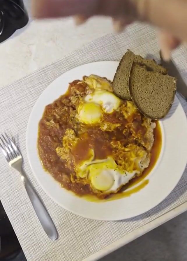 A hand sprinkles crumbled feta cheese over a plate of fried eggs in tomato sauce, served with two slices of dark bread. The plate is placed on a gray woven placemat on a light-colored countertop. A fork and knife are arranged next to the plate. A black electric kettle and a stainless steel container are visible in the background.