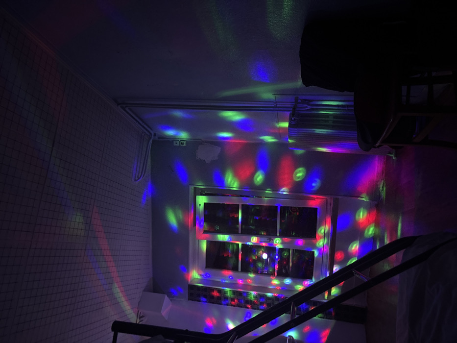 - "An interior room, located in Strasbourg, France, is depicted under low ambient light, illuminated by numerous projected red, green, and blue oval-shaped light patterns scattered across the walls, ceiling, and floor" by FM-rEDxu1, licensed under CC BY 4.0