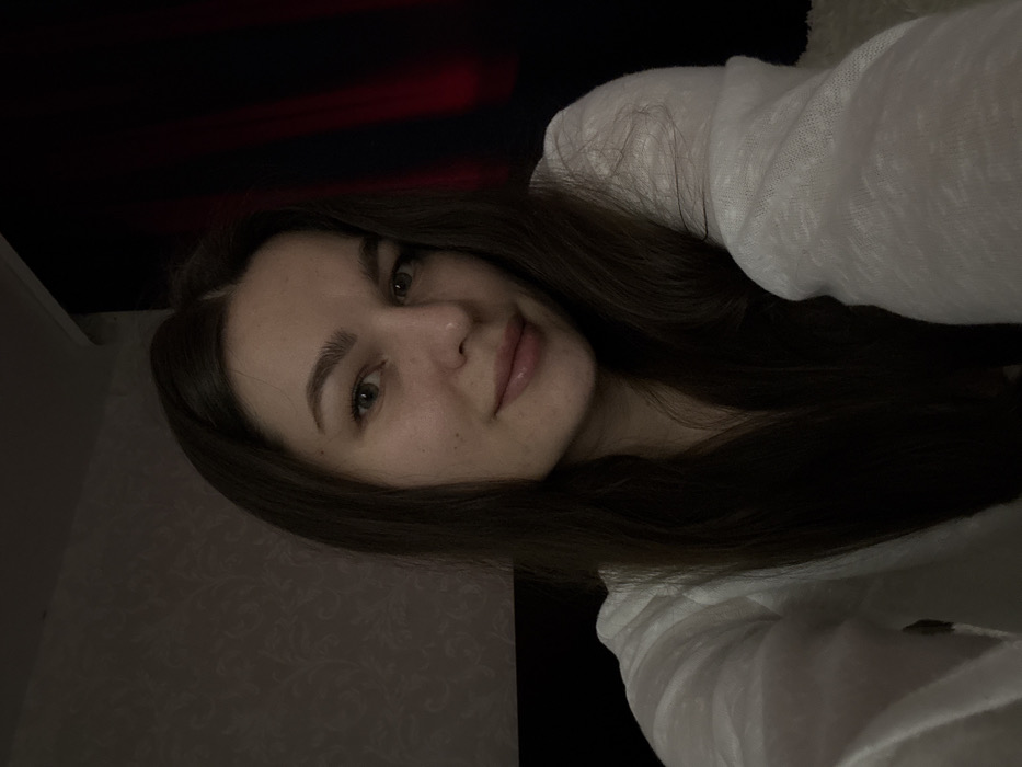 A young adult female is depicted in a self-portrait taken indoors within a private residential setting in Chaikovsky, Russia. Her face, characterized by long dark hair, light eyes, and a slight smile, is illuminated by a frontal light source and dominates the upper portion of the frame. She is wearing a light-colored, long-sleeved garment of thin fabric. Her left shoulder and arm are visible, extending towards the lower left. The background to the left of the subject features a wall adorned with patterned wallpaper. To the right, a dark, vertical fabric element, possibly a curtain, is visible, accented by a narrow, vertical strip of reddish-orange light. A light-colored, textured surface, likely a blanket or cushion, is present in the lower right corner of the image. The overall scene is dimly lit.