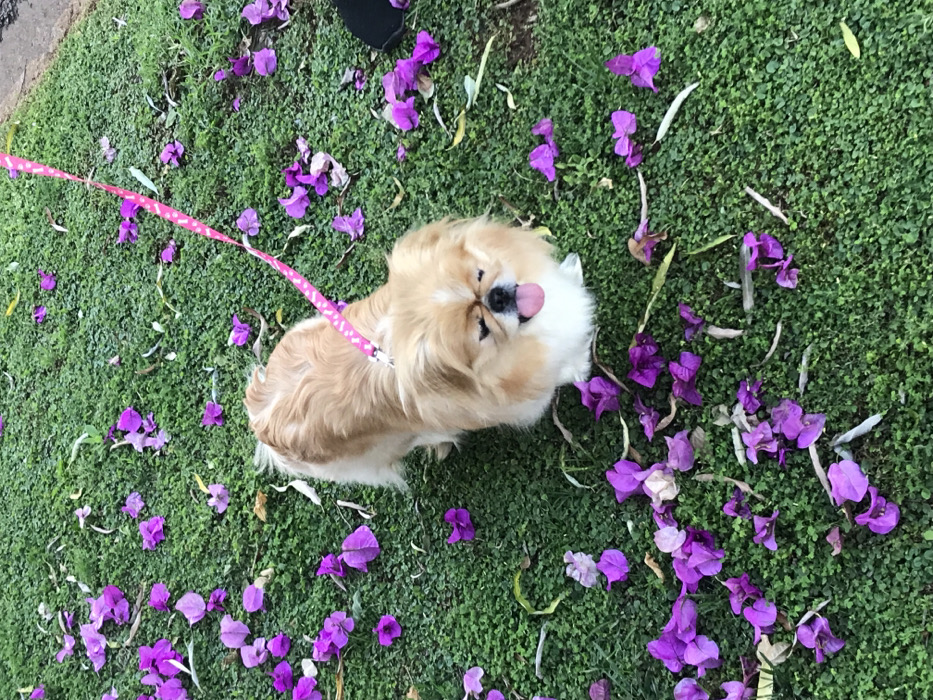 A small, long-haired dog, predominantly light brown/cream with a white chest and underbelly, stands on a vibrant green groundcover. Numerous fallen purple petals are scattered across the ground. The dog is positioned centrally, facing slightly right with its head turned towards the viewer. Its eyes are closed or heavily squinted, and its pink tongue is extended from its mouth. A pink leash with white polka dots is attached to the dog's back, extending upwards and out of the frame to the right. A dark, partially obscured object, possibly footwear, is visible in the upper right corner. A darker strip of ground or pavement runs along the upper left edge of the frame. The scene is located in Germiston, South Africa.