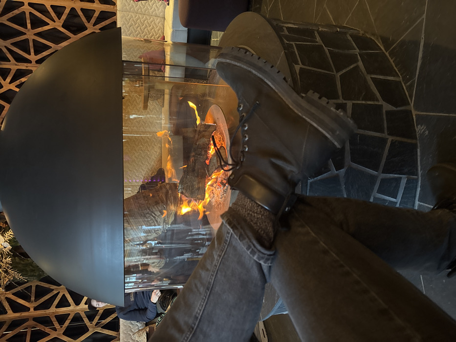 A person wearing black jeans and black boots crosses their legs near a modern fireplace. Flames are visible through the glass of the spherical, partially covered fire pit. Abstract decorative patterns are present on the walls and floor nearby. Reflections of people and objects are visible on the glass surface of the fireplace.