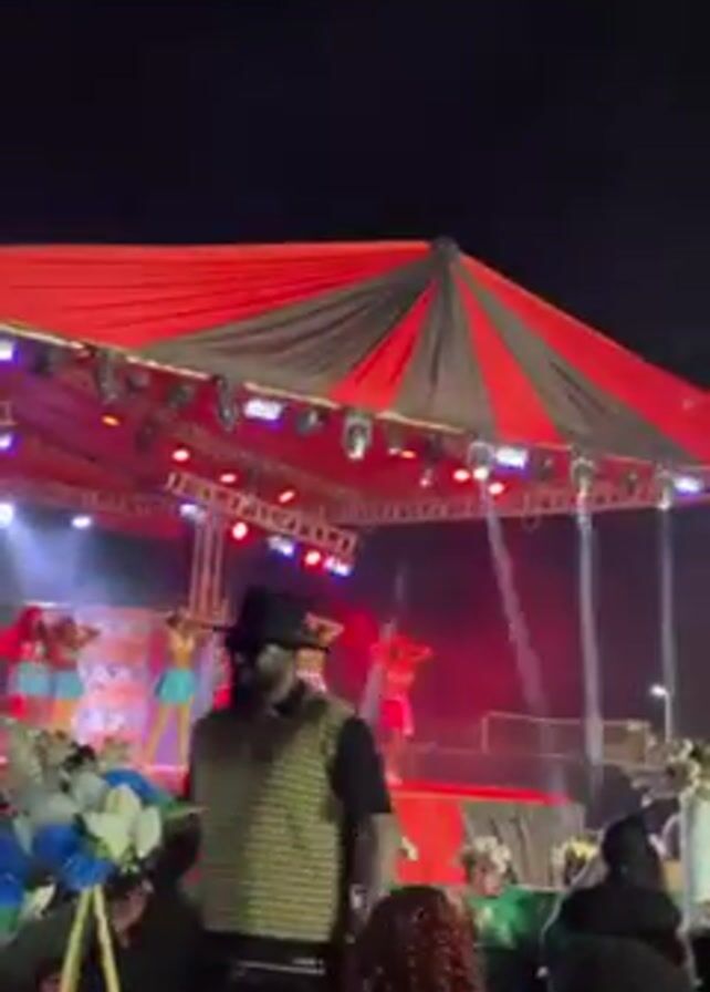 nighttime outdoor concert or performance. A stage with a red and black striped canopy overhead is visible, illuminated by stage lights. Several dancers in coordinated, colorful outfits are performing on stage. A man in a black hat and vest is standing in the foreground, facing the stage, presumably watching the performance. Other people are also visible in the audience, watching the show. The environment appears to be a large open space or field, possibly a festival or event ground.