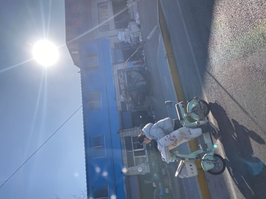 A person, wearing a puffy jacket and patterned pants, appears to be interacting with a light green electric scooter parked on the side of a road. The background includes a tall, blue building with several windows. The sun shines brightly in the sky, casting strong shadows and creating lens flare effects. There is some clutter or debris visible near the base of the building. The scene conveys a sense of daily life or activity in an urban or semi-urban environment.