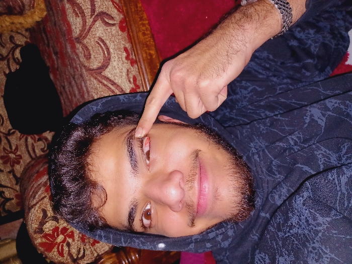 A young man, wearing a dark patterned hoodie, lies on a patterned sofa. He gazes at the camera with brown eyes, a beard, and a slight smile. His left eye appears red. The index finger of his right hand, adorned with a metal bracelet, touches his left eyelid. The setting suggests a relaxed, informal environment.