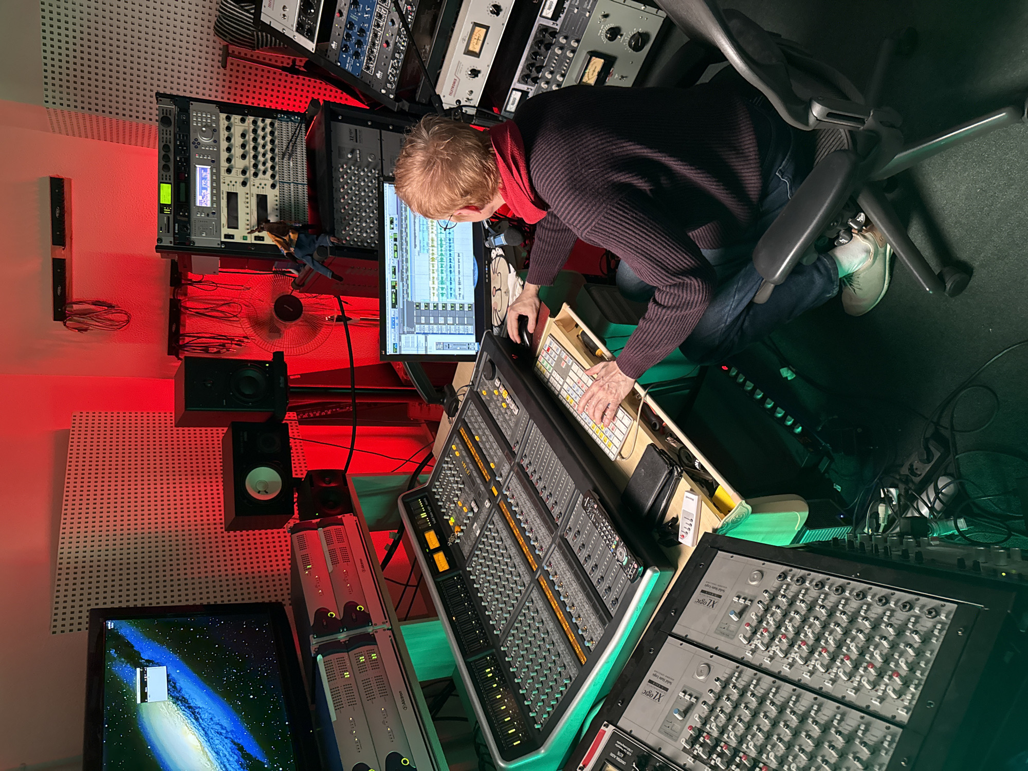 A medium, high-angle shot shows a man working in what appears to be a music or audio production studio. The man is seated in an office chair and is leaning over a large audio mixing console, with his hands on a computer keyboard and mouse. He has short, light-colored hair and is wearing a dark sweater with a red scarf or undershirt visible at the neck. He is also wearing jeans and light-colored shoes. In front of him is a computer monitor displaying a complex audio editing program. The audio mixing console is large and complex, with many faders, knobs, and buttons. To the left and right of the console are racks of audio equipment. A second monitor is visible to the lower left, showing a nebula or galaxy image. The walls of the studio are covered in soundproofing material. The lighting is somewhat dim, with red and green accent lights adding to the studio atmosphere. There are speakers mounted on the wall above the lower monitor. The overall impression is of a professional audio production environment. There is nothing in the image that identifies the location of the studio as Moscow, Russia.