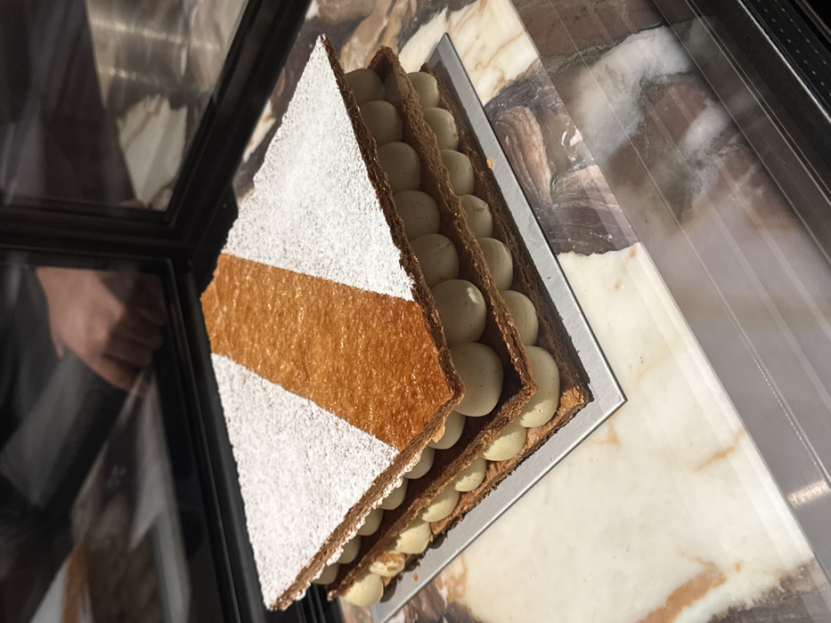 A triangle-shaped pastry sits in a display case. The top layer is decorated with a diagonal stripe pattern of powdered sugar and caramelized dough. Two layers of custard filling are visible between the crispy layers. The pastry is in a rectangular tray and placed on a marble surface. A hand is visible in the reflection of the glass case.