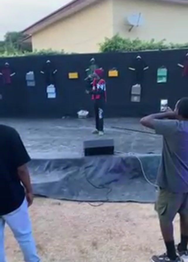 A person in a red hat and a black and red jacket stands on a makeshift stage, holding a microphone and performing. Behind them is a black backdrop adorned with hanging articles of clothing. To the left and right of the stage, two individuals stand recording the performance on their mobile phones. The setting appears to be outdoors, with a building in the background. The ground is covered with loose material.