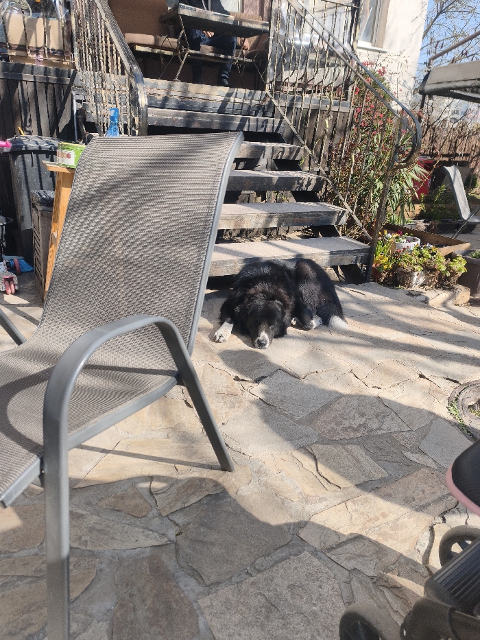 The image depicts an outdoor residential area in Sofia, Bulgaria, characterized by a flagstone patio under bright sunlight. In the foreground, a grey metal-framed outdoor lounge chair with a woven mesh seat is positioned on the left, casting a distinct shadow. To the right of the chair, a large black and white dog with thick fur lies prone on the flagstones, resting its head on its front paws. Its muzzle and paws show white markings. In the midground, a dark, weathered set of outdoor stairs with ornate wrought-iron railings ascends towards an upper landing or patio. On this upper level, two individuals are partially visible; one person's lower legs and feet, clad in dark trousers and striped socks, are seen seated at a dark outdoor table or bench, while another person's legs are also discernible. To the left of the stairs, a dark fence or structure stands near a small table holding a blue bottle. To the right of the stairs, a light-colored building wall with a window is visible, bordered by multiple potted plants and green foliage, some with reddish leaves, on the ground. A partial view of a wheeled object, possibly a stroller, is visible in the lower right corner.