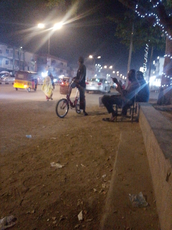 Night scene with a mix of street activities. A man stands with a small red bicycle that has a basket. Two men are sitting on a makeshift bench pointing their hands. A yellow auto rickshaw is moving in the distance. There are various street lights illuminating the scene and a tree decorated with white lights. A concrete curb extends into the foreground, with a ground surface littered with debris.