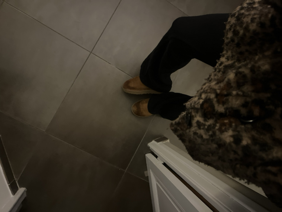 A person stands on gray tiled flooring, wearing black pants and tan UGG boots. A textured, animal-print jacket or coat is partially visible, obscuring the upper portion of the image. A white cabinet or fixture is located in the lower right corner of the frame. The perspective is from slightly above, looking down at the person's feet.