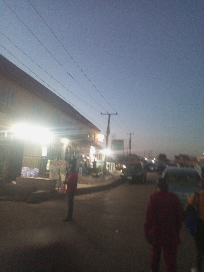 The image depicts an urban street scene in Jos, Nigeria, during the early evening or twilight hours