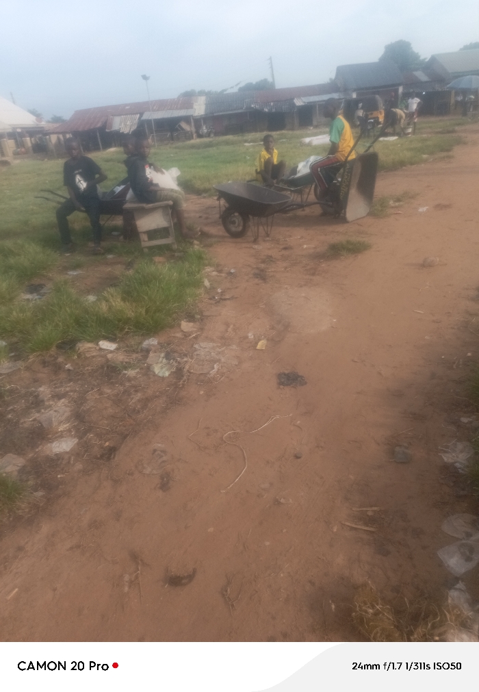 This image depicts an outdoor scene in Markurdi, Nigeria, characterized by an unpaved, reddish-brown dirt foreground and a grassy strip on the left leading to a group of individuals and objects. The ground exhibits scattered debris, including plastic remnants and organic material. Four individuals are visible in the midground, situated near several wheelbarrows. On the far left, an individual wearing a dark shirt and pants is leaning on or standing beside a black wheelbarrow. To their right, a second individual, also in dark attire, is seated on a light-colored wooden stool, with a white, possibly fabric, object draped over or held by them. A black wheelbarrow is positioned directly in front of this individual. Further to the right, a third individual, clad in a yellow and green shirt with dark pants, is seated atop or beside another black wheelbarrow that appears to be attached to a small, two-wheeled vehicle or frame. Another black wheelbarrow rests on the ground immediately to the right of this setup. A fourth individual, wearing a yellow shirt and dark shorts, is seated on the ground in the background, partially obscured by the wheelbarrow and vehicle assembly. The background features a line of low-rise structures with corrugated metal roofs, indicative of shops or market stalls. Beyond these, a hazy, light-colored sky is visible. The overall impression is an informal urban or semi-urban setting, possibly a market periphery or roadside.