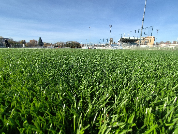 - "The image depicts a low-angle view across a synthetic turf sports field under a clear blue sky, situated in Schiltigheim, France" by FM-EibkQ2, licensed under CC BY 4.0