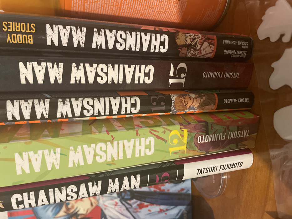 - "A stack of "Chainsaw Man" manga volumes is displayed" by FM-Z8xZQ2, licensed under CC BY 4.0