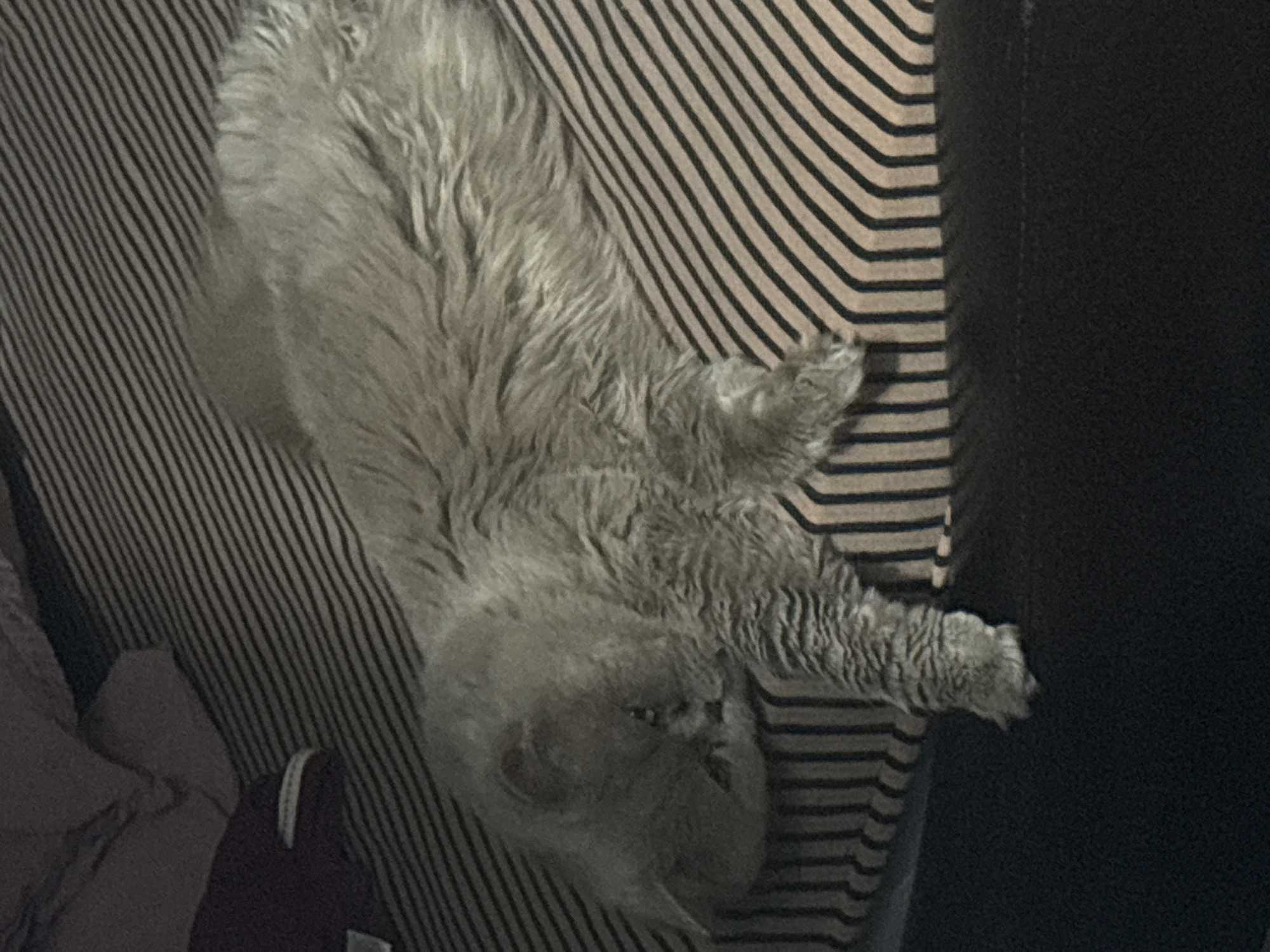 A gray, fluffy cat lies on a striped surface