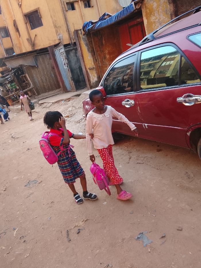 Two young girls stand on a dirt road beside a red car. One girl wears a blue and red dress with a pink backpack. She covers her face with her hand. The other girl wears a light pink shirt and red patterned pants, holding a pink backpack. Behind them are weathered buildings and glimpses of other people. The scene suggests a residential neighborhood or a street with limited infrastructure.
