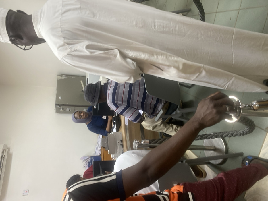 The image displays an indoor scene within a commercial or administrative building in Maiburiji, Nigeria, likely a bank or service center, characterized by queuing stanchions