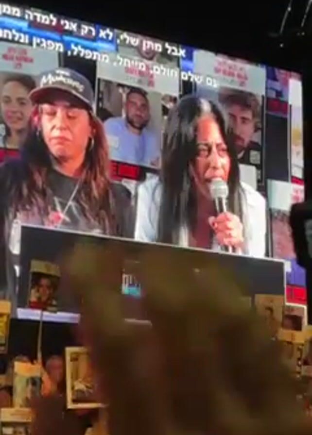 crowd of people holding up signs with pictures of faces during a public demonstration. Two women are speaking into microphones on a stage in front of the crowd. Behind them is a large screen showing the speakers, the crowd, and text in Hebrew. One of the signs held by the crowd is written in English and reads "TRUMP'S LEGACY CRUMBLES AS THE GAZA WAR PERSISTS". The environment appears to be outdoors at night.