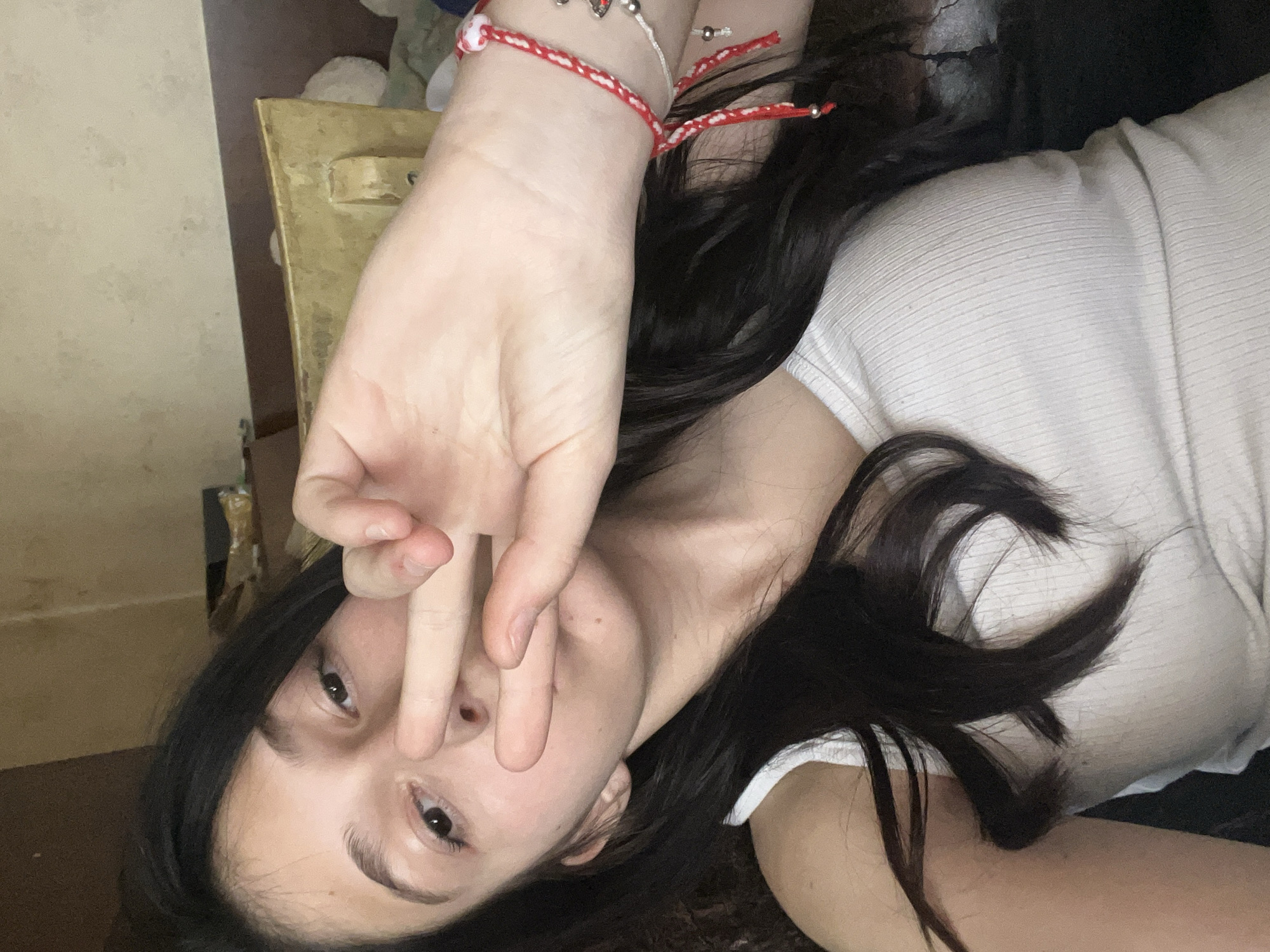A young female, appearing to be in her late teens or early twenties, is depicted in an indoor setting. She has long, dark hair and is wearing a light-colored, ribbed tank top. Her left hand is raised in front of her face, forming a V-sign with her index and middle fingers, partially obscuring her nose and mouth. She looks directly towards the camera. On her right wrist, a red and white braided string bracelet with a white bead is visible, along with another silver-colored bracelet featuring small beads. The background consists of a light brown wall with faint texture, and a dark brown, possibly wooden, furniture element is partially visible behind her right shoulder. Other indistinct, light-colored objects are present in the far right background. The specific location within Vidin, Bulgaria, cannot be determined from the visual information provided.