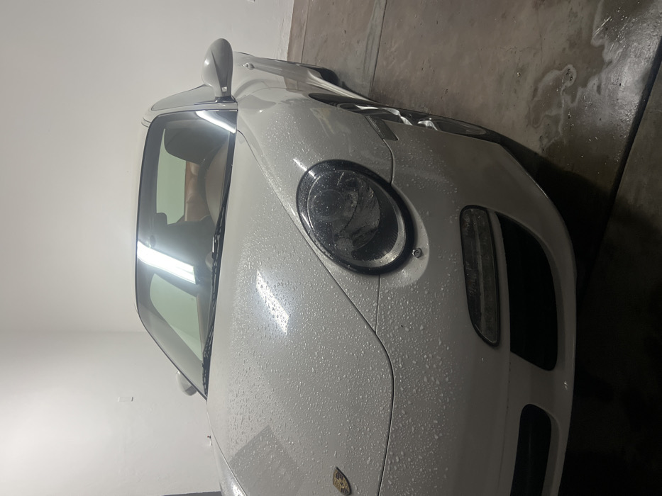 A white Porsche is parked indoors, presumably a garage, with water droplets covering its surface