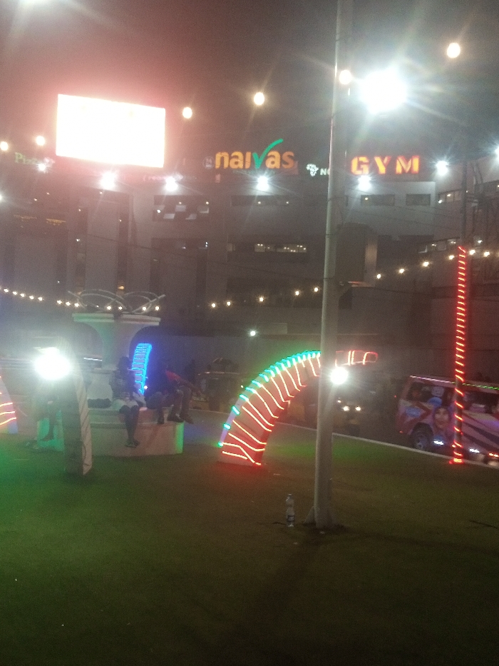 This image depicts a brightly illuminated night scene in Majengo ward, Kenya, focused on an outdoor commercial area. In the background, a multi-story building displays prominent illuminated signs: "Naivas" with orange lettering and a green checkmark, and "GYM" in red-orange characters. To the left of "Naivas," a large, brightly lit rectangular billboard is visible. The foreground consists of a green turf area, presumably artificial grass. Within this area, several decorative light structures are present. To the left, a white illuminated arch leads to a blue arched light tunnel. Adjacent to this, a white stone bench or platform holds three seated individuals, their specific details obscured by distance and light. A central light pole extends vertically, and a clear plastic water bottle rests on the turf near its base. Further to the right, another large, arch-shaped structure is illuminated with alternating red and green lights. On a paved surface to the right, two vehicles are visible. One vehicle, a van or SUV, features a distinct multi-colored custom paint job including a graphic of a face. Another vehicle with illuminated headlights is partially obscured behind the red and green light arch. Overhead, numerous string lights are suspended across the scene, contributing to the overall illumination.