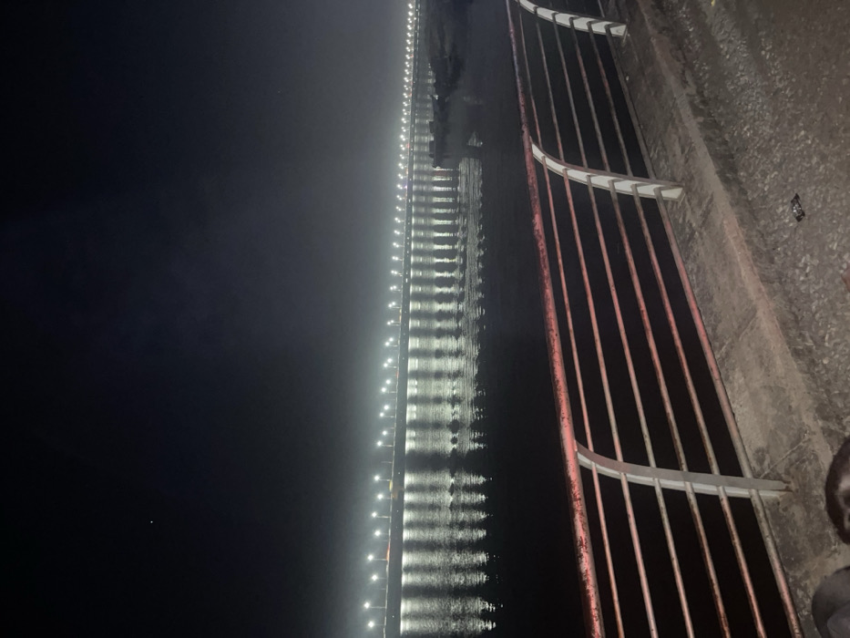 A nighttime view captures a bridge illuminated by a series of lights reflecting in the dark water below. The railing on the right side appears aged with visible wear and tear. A dim and cloudy sky creates an ominous atmosphere in the image. The long exposure of the image captures the stillness and the dark sky of the night.