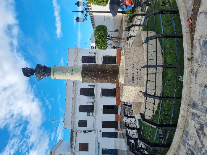 The image displays a public square in Moguer, Spain, featuring a monument dedicated to Christopher Columbus under a partially cloudy blue sky