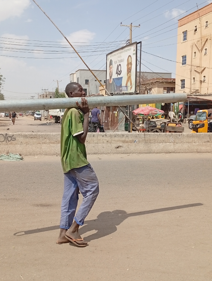 The image captures a street scene in Sabon Gari East, Nigeria. An adult male, dark-complexioned and wearing a faded green short-sleeved t-shirt, light blue trousers, and brown flip-flops, walks from left to right in the foreground. He carries a long, galvanized metal pipe horizontally across his left shoulder, his head turned slightly to the right. His figure casts a long shadow on the light-colored, dusty paved ground. In the mid-ground, a busy paved road is visible, separated by a low concrete barrier. Vehicles, including a white truck, cars, and a yellow three-wheeled motorized tricycle, are present. Multiple pedestrians are seen in the distance. The road is lined with informal market stalls, some featuring red umbrellas, and scattered debris. The background displays urban infrastructure. On the right, a multi-story building with a light brown facade and multiple rectangular windows is prominent. Centrally, a large billboard mounted on poles features two male figures and text, including "BUILDING FOR MODERN DEVELOPMENT," "SEN. TINUBU?", and the number "40". Overhead, numerous electrical wires crisscross the sky, supported by utility poles. The sky is clear and light blue with minimal cloud cover.
