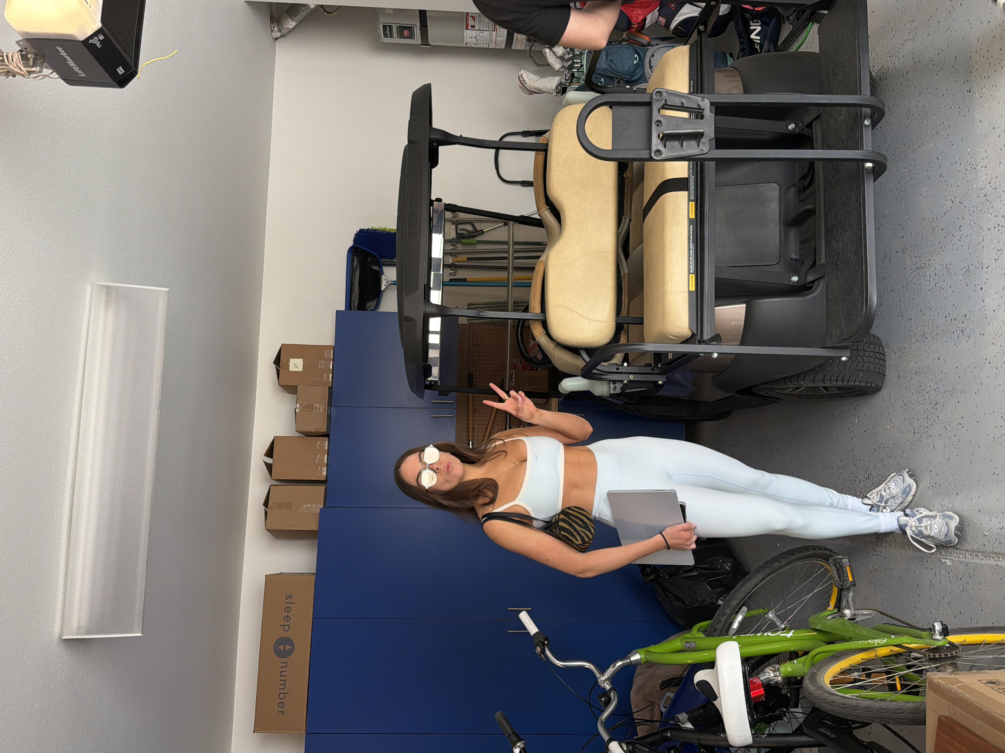 The image depicts an interior garage setting in La Quinta, United States of America. A young woman dressed in light blue athletic attire, including leggings and a top, stands in the center of the frame, holding a tablet and giving a peace sign. She wears sunglasses and a small, patterned purse. A golf cart occupies the upper right portion of the frame, with other golf-related items partially visible nearby. Behind the woman are blue storage cabinets, with cardboard boxes stacked on the left. A green and yellow bicycle is positioned in the lower right, partially obscured. The lighting is moderate, and the background shows a cluttered garage environment.