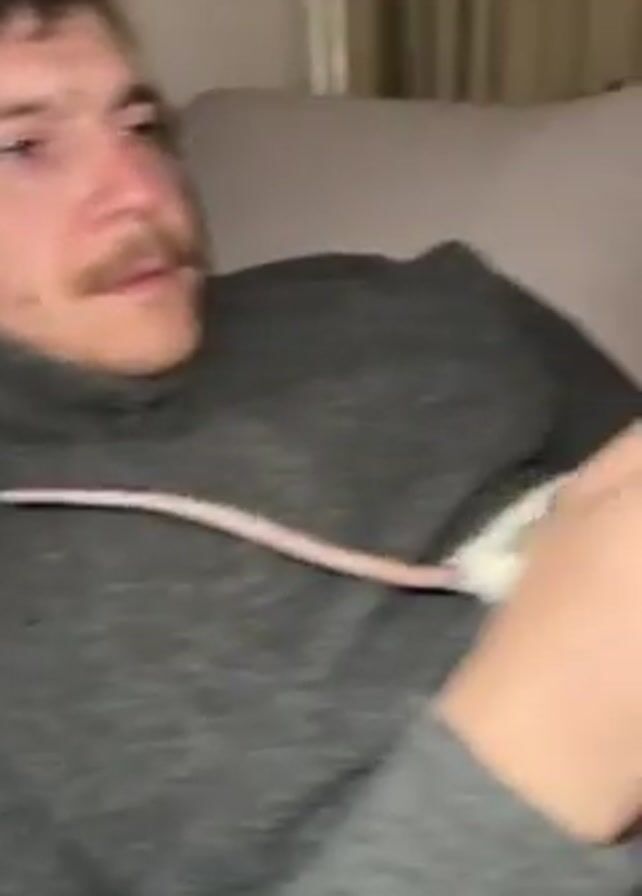 A man with short brown hair and a mustache is lying on a couch. He is wearing a gray sweater. A white and brown rat is on his shoulder. A hand holding a cell phone with a sticker on it adjusts the camera to follow the rat. The rat walks down the man's body and onto the couch. It then walks into the space between the couch cushions.