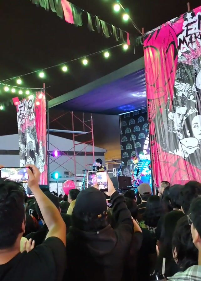 A concert is in progress with a band performing on stage, which is decorated with pink banners featuring the text "EMO MERCHANT". The crowd is gathered, with many individuals holding up their phones to record the performance. The stage is lit with blue, green, and purple lights. The environment appears to be an outdoor venue, partially covered. There are string lights hanging overhead and scaffolding visible on the side of the stage.
