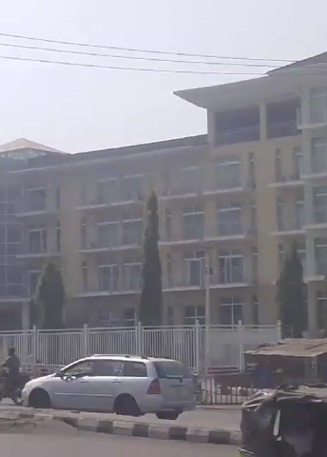 street scene in a city. A large, modern building with many windows and balconies is visible in the background, behind a white metal fence. There are several tall, thin trees in front of the building. A street with vehicles, including motorcycles and auto rickshaws, is in the foreground. People are visible walking and riding on the vehicles. There is a bus stop shelter in the left corner. The sky is bright, and the scene appears to be filmed during the day.