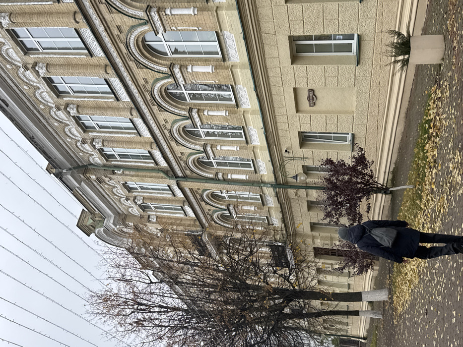 An overhead view on a uniformly overcast day depicts a street scene in Mahilyow, Belarus, specifically along Ulitsa Leitseyskaya (ВУЛIЦА ЛЕIЦЭЙСКАЯ), as indicated by a street sign affixed to the building. The primary subject is a multi-story, historic-style building with a light beige brick or stucco facade, extensively adorned with white and green decorative elements, including intricate window surrounds, pilasters, and cornices. The building features numerous windows, predominantly arched on the lower visible levels and rectangular on the upper, all with white frames. Green drainpipes run vertically along the facade. In the foreground, a single individual, wearing a dark winter coat, dark pants, and a dark beanie or hood, walks away from the viewer towards the left side of the frame, carrying a grey backpack. The person's back is to the camera. The sidewalk is paved with dark patterned pavers and heavily scattered with yellow and brown fallen leaves, indicative of autumn. Several deciduous trees with bare branches line the sidewalk to the left, their lower trunks painted white. A dark reddish-purple shrub is planted closer to the building, and a green plant is contained within a square cream-colored planter on the far right. A black, ornate wall-mounted street lamp is visible on the building's ground-floor facade. Above, against the grey sky, multiple parallel strands of thin wires, possibly decorative lighting, are suspended across the street.