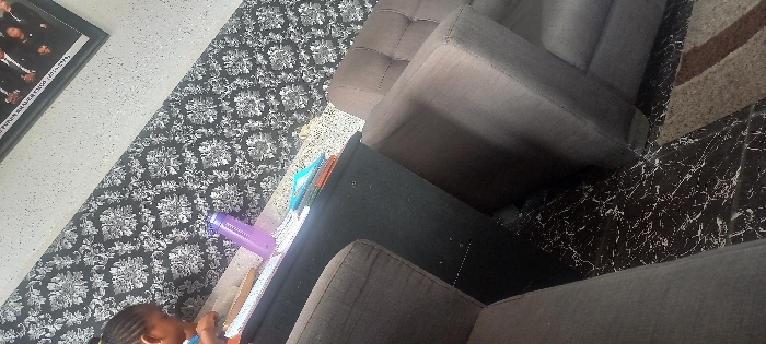 An indoor scene in Effurun, Nigeria, is depicted at an oblique angle. The foreground shows sections of two upholstered gray armchairs or sofas. A dark floor with light speckles and a brown patterned rug are visible beneath the furniture. Centrally, a black rectangular table or desk holds a purple water bottle, white papers, and a stack of multi-colored books. On the left, a person with braided hair is partially visible, leaning over the table, holding a writing implement, and appears to be writing or drawing on the papers. The background wall features black and white patterned wallpaper, above which is a lighter, textured wall section. A framed group photograph with accompanying text is mounted on the upper wall section in the upper right area of the image.