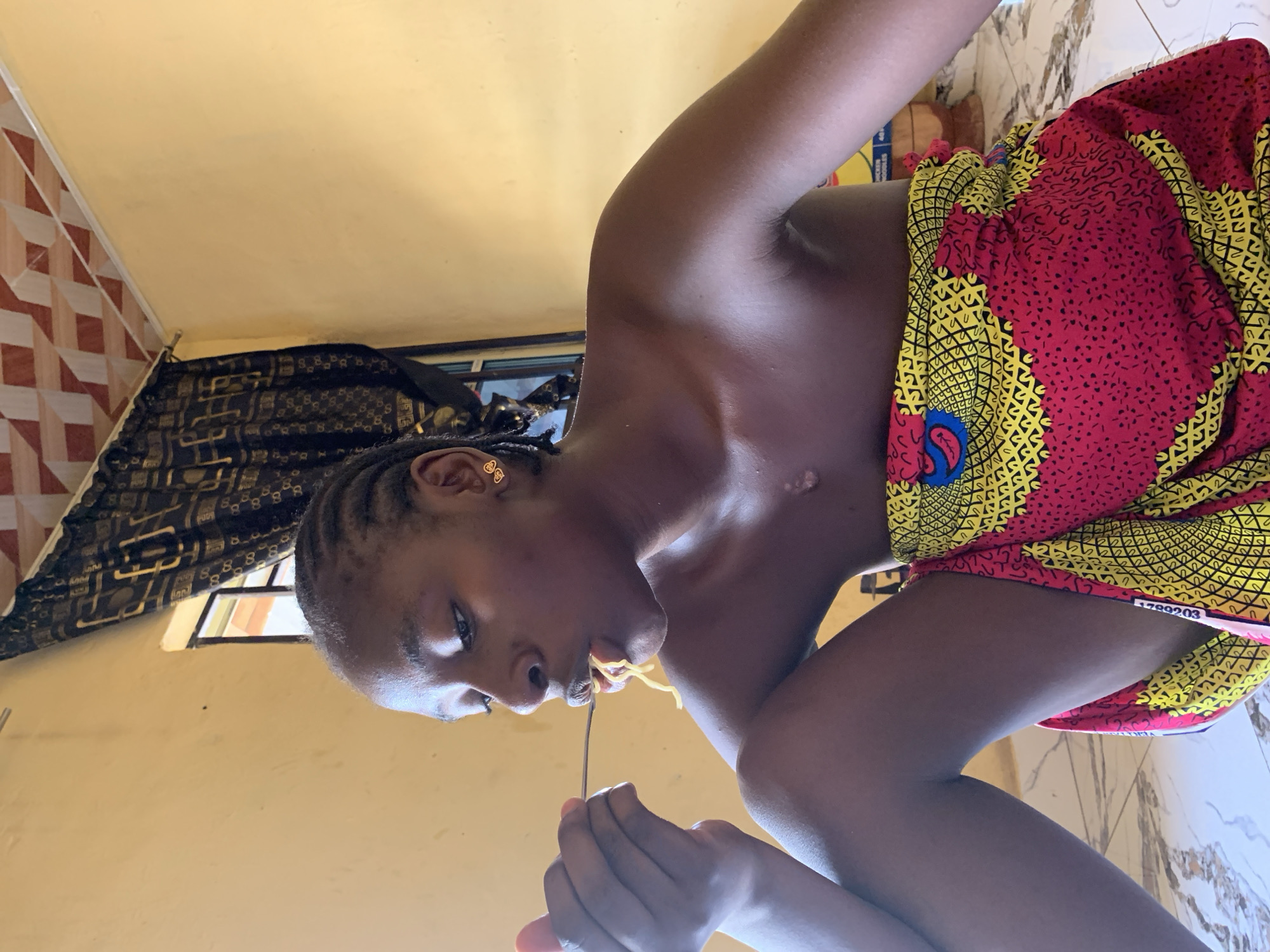 A person eats spaghetti in an indoor setting in Keffi, Nigeria. The person has dark skin, braided hair with gold earrings, and is wearing a red and yellow patterned cloth around their lower body. They are holding a fork with spaghetti on it, bringing it to their mouth. The background includes a yellow wall, a window covered by a patterned fabric, and a tiled floor. The lighting is bright, illuminating the scene with a warm tone.