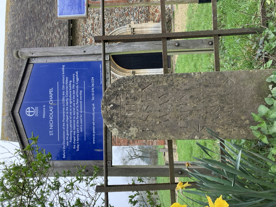 The image depicts an exterior scene on an overcast day, centered around a stone waymarker and an informational sign, with a historic building in the background. In the immediate foreground, to the left, are vibrant yellow daffodils and green foliage, partially obscuring the base of a weathered, grey stone milestone. The milestone bears carved inscriptions: "THE ESSEX WAY" at the top, followed by "EPPING" with a left-pointing arrow and "41 miles," and below that, "HARWICH" with a right-pointing arrow and "40 miles." Behind the milestone, a rustic wooden fence structure with metal elements runs horizontally across the midground. Beyond the fence, a prominent blue informational sign is mounted on wooden posts. The sign displays "The Church of England" logo and the text "Welcome to ST. NICHOLAS' CHAPEL." Below this, a detailed description states: "Before the Dissolution of the Monasteries (c1530s) this 12th-century building was the gatehouse chapel to the nearby Cistercian Abbey. Following a period of use as an agricultural building, the chapel was restored to sacred use in the late 19th century. Today it forms part of the Parish of St. Peter ad Vincula, Coggeshall, and is used for occasional worship." The sign also provides a website "www.st-peter-ad-vincula.org.uk" and a telephone number "Tel: 01376 561234." The location is thus confirmed as Coggeshall, United Kingdom. In the background, behind the sign and fence, stands St. Nicholas' Chapel. The building features walls constructed from a mix of dark stone and reddish-brown brickwork. A dark, arched entryway is visible on its façade. The chapel has a dark, tiled roof. To the right of the main blue sign, a smaller, partially visible blue sign is affixed to the chapel wall. The ground in the midground and background is covered in green grass. Sparse trees with bare branches are visible on the horizon beneath a uniform, light grey sky. No individuals are present in the scene.