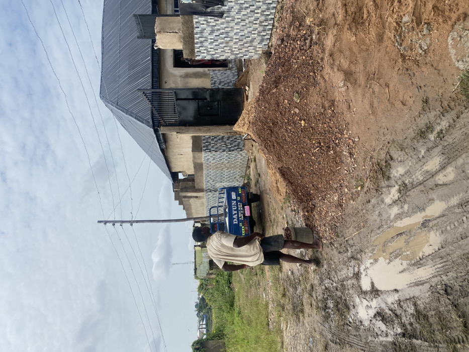 The image depicts an outdoor scene in Lokoja, Nigeria, under an overcast sky. An unpaved, muddy dirt road with distinct tire tracks and standing water in puddles dominates the foreground. To the right, a single-story building features a dark grey corrugated metal roof, light-colored rendered walls, and a black metal gate. The lower section of its perimeter wall is tiled with a repeating geometric pattern of grey, white, and black squares. Adjacent to this building are partially constructed or renovated concrete structures, and a large mound of reddish-brown soil and gravel is situated near the entrance. In the midground, a male individual stands with his back mostly to the camera, wearing a tan short-sleeved shirt and dark shorts, and is barefoot. He stands beside a white bucket containing small, dark aggregates. Behind him, parked on the dirt road, is a blue three-wheeled utility vehicle, branded "DAYUN," with a cargo bed. Its pink license plate displays "AJKU 267 KGS." A wooden utility pole, equipped with multiple overhead power lines, stands near the center-left. Green vegetation and distant, hazy structures are visible on the left side of the frame.