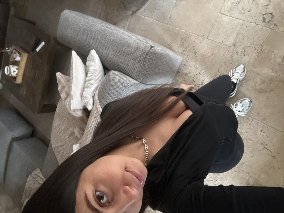 The image depicts an indoor residential setting; the specific location in Antibes, France, cannot be determined from the visual evidence. A female subject, with long dark hair, light brown eyes, and glossy lips, is captured in a high-angle, waist-up view, appearing to take a selfie. She is dressed in a black, long-sleeved zippered top, partially unzipped to reveal a black undergarment, black leggings, and silver metallic sneakers with white soles and laces. A silver-colored chain necklace with interlocking oval links is visible on her neck. The flooring consists of light-colored, possibly tiled material. In the background, a light grey modular sofa is visible, adorned with multiple neutral-toned decorative pillows. Behind the sofa, a dark wooden square coffee table holds a wooden tray containing a white ceramic candle holder, a reed diffuser, and another small container, alongside a black remote control and a white object positioned directly on the tabletop.