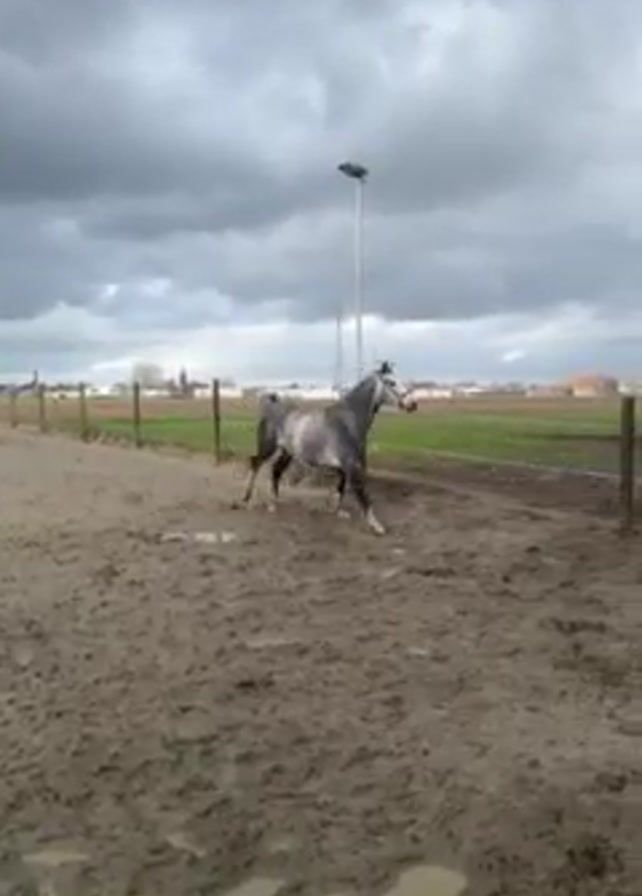 gray horse running in a muddy paddock under a cloudy sky. The horse is wearing a halter, and there is a fence surrounding the paddock. In the background, there are green fields, power lines, and buildings. The horse runs back and forth, kicking up mud as it goes. Another horse is visible in the background, standing calmly near the fence. A tall pole with a light fixture is next to the paddock fence.