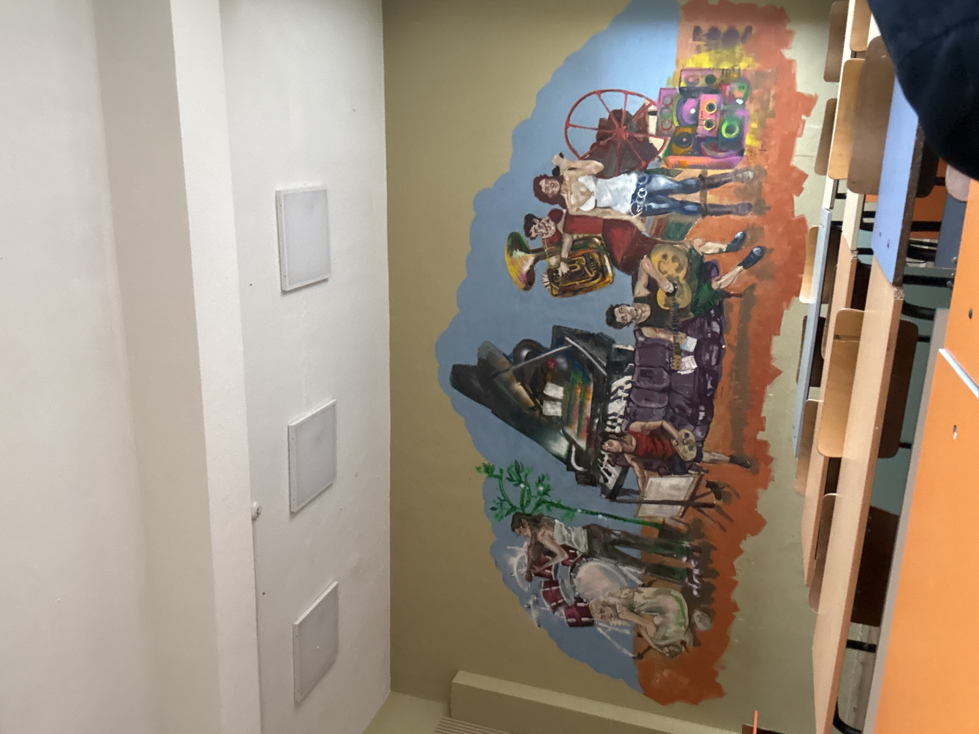 The image displays an interior view of a room, likely a classroom or educational facility, in Pleven, Bulgaria. The primary subject is a large, colorful mural painted on a beige wall, depicting an energetic musical ensemble. The mural's background features a light blue, wavy shape resembling clouds or an abstract sky, above an irregular orange-brown ground layer. Seven stylized figures populate the scene, engaged with various musical instruments. From left to right: 1. A seated blonde female figure in a light dress. 2. A standing male figure playing a violin, positioned in front of a white and red drum kit. 3. A black grand piano with its lid open, revealing keys, is centrally featured. 4. A male figure in a red tank top is seated at a keyboard in front of the grand piano. 5. Another male figure in a dark tank top and green shorts is seated on a purple bench, playing an acoustic guitar. 6. A male figure is standing behind, playing a large brass instrument resembling a tuba or sousaphone, wearing a red shirt. 7. A female figure in a white tank top and blue jeans stands centrally, holding a microphone. 8. To the far right, a large red spoked wheel stands next to a stack of brightly colored, abstractly rendered audio equipment, including speakers and boomboxes. A slender green plant with sparse leaves stands upright near the violin player. The room's environment includes a white ceiling with two square, recessed LED panel lights. In the foreground, rows of light-colored wooden desks and chairs are visible, arranged in a typical classroom configuration. The desk closest to the camera features an orange-colored top, and a dark-clothed shoulder and arm of a seated individual are visible in the bottom right corner. The walls are painted a light beige-brown above the mural. Based on the classroom furniture and educational nature of the mural, the location is identified as an educational institution or a youth cultural center within the city of Pleven, Bulgaria.