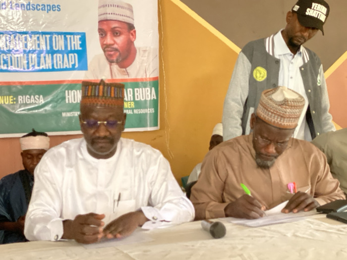 An indoor scene in Rigasa, Nigeria, depicts a formal event, likely a signing ceremony. In the foreground, two men are seated at a table covered with a white tablecloth. The man on the left wears a white traditional tunic and a patterned cap, with glasses and a pen in his shirt pocket, hands resting on the table. The man on the right wears a brown traditional tunic and a patterned cap, with a grey beard, and is actively signing a document with a green pen. A black microphone is positioned on the table in front of him. Behind them, a man stands wearing a grey letterman-style jacket, a white shirt, and a black baseball cap inscribed with "YERI SHATTIN." He is looking down towards the signing activity. In the background, partially visible, are other individuals also in traditional attire. A large banner hangs behind the seated men, displaying text such as "AGREEMENT ON THE TION PLAN (RAP)," "VENUE: RIGASA," "HON. AR BUBA," and "MINISTRY OF RAL RESOURCES," alongside a portrait of a man. The walls are light-colored.